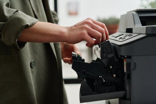 Closeup of hands of unrecognizable female office worker refilling ink in printer cartridge
