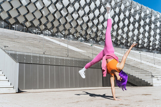 Carefree woman wearing colorful sportswear making cartwheel movement on the street