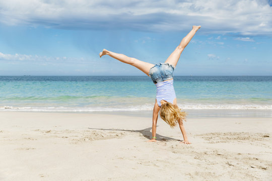 Relaxed woman enjoying sun, freedom and life turning cartwheel on beautiful beach in sunset. Young lady feeling free, relaxed and happy. Vacations, freedom, happiness, enjoyment and well being.