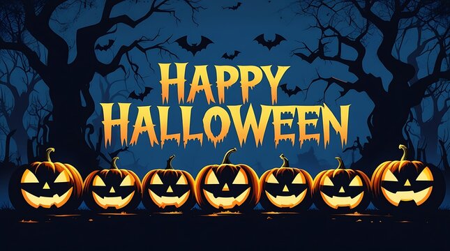 Spooky happy halloween glowing text with a carved pumpkin and bats against a dark shadowy night sky backdrop for festive holiday celebrations.