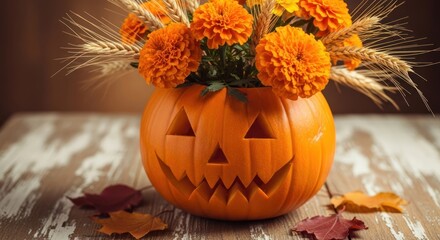 A carved pumpkin filled with orange flowers and wheat stalks sitting on a rustic wooden surface