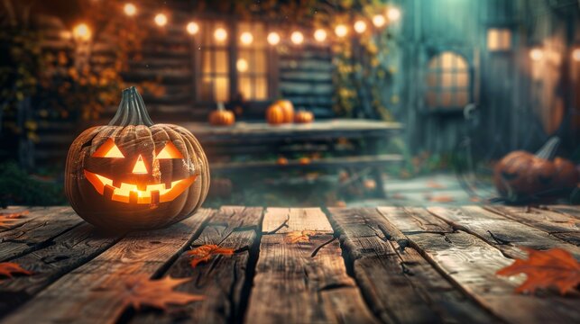 Eerie evening with halloween pumpkin on wooden boards