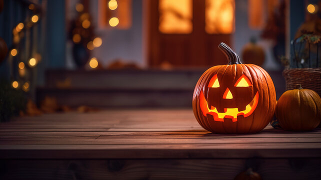 Halloween carved pumpkin on the porch outside