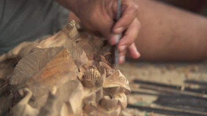 Closeup of wood carver hand making sculpture with chisel.