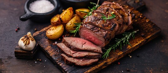 Classic British Sunday roast with sliced roast beef complemented by garlic and salt, showcased on a rustic charred wooden board.