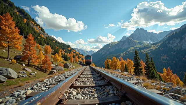 A speeding train pierces through rugged mountains, its steel carriages glinting in sunlight as it carves a serpentine path through the rocky terrain