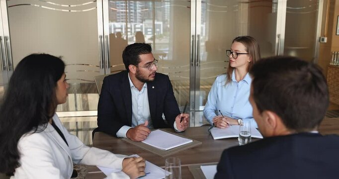 Young Arabian businessman conduct business meeting seated at conference table with clients or staff members, express point, explain joint project details, make speech, looks confident. Seminar event