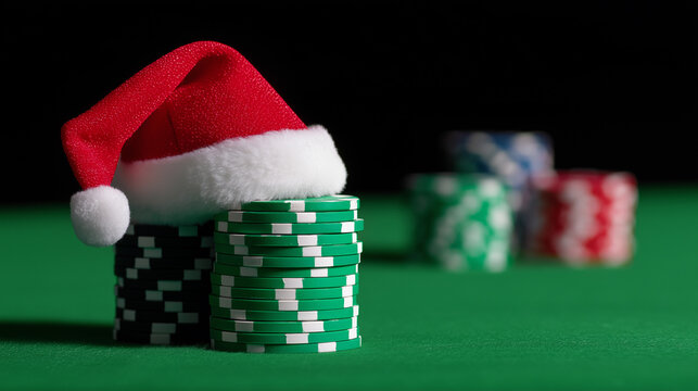 Stack of poker chips wearing a Santa hat on a dark background symbolizing holiday gambling and luck.