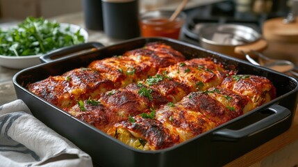 Baked stuffed cabbage rolls in a casserole dish