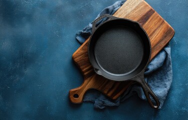 Empty cast iron skillet, wooden cutting board, and a linen cloth on a dark blue textured surface