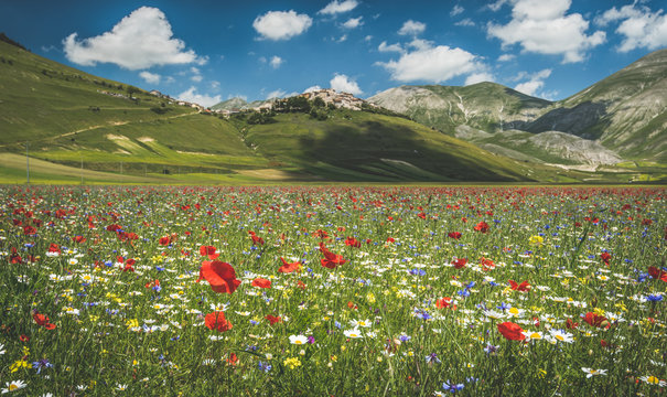 Castelluccio of Norcia blooming. Monti Sibillini National Park, Perugia district, Umbria, Italy, Europe.