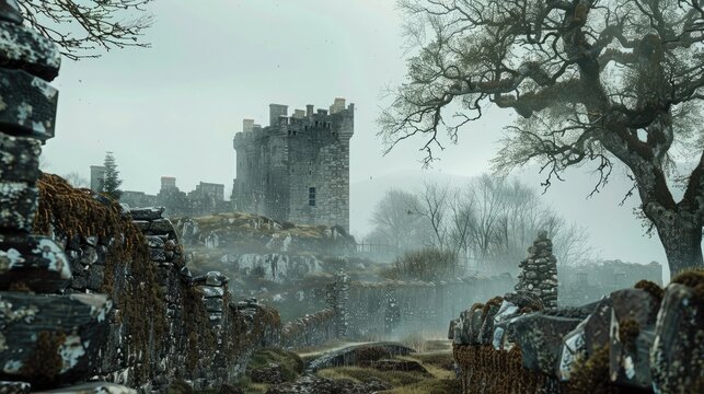 A medieval Scottish castle with rugged stone walls and a towering keep, set amidst mist-covered moors and ancient oak forests.