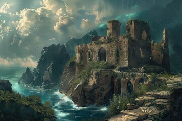 Ancient castle ruins stand tall on a rocky cliff overlooking the sea