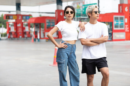 portrait man and woman fashion poses with sunglasses and white t-shirt