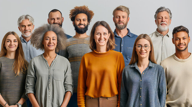 A diverse group of people smiling in casual clothing on a light gray background, concept of teamwork and diversity. Generative AI