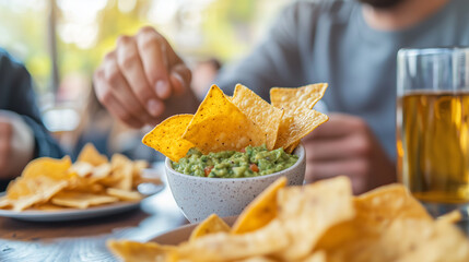 close-up shot of a man savoring tortilla chips with guacamole, surrounded by friends in a restaurant. Ideal for showcasing the experience of casual dining, food enjoyment, and soci