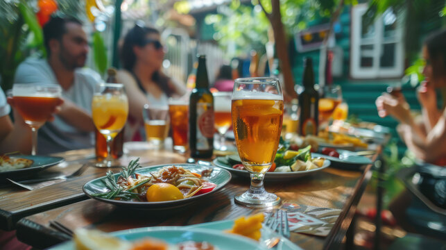 Friends enjoying a casual dining experience with burgers and drinks. Group of people sharing a meal and laughter at a restaurant. Joyful gathering around a table full of colorful food and beverages.
