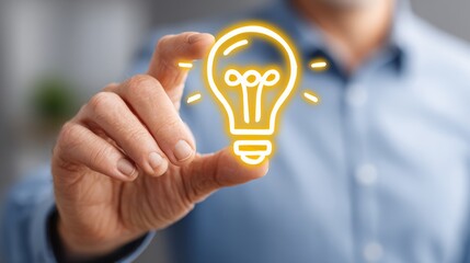 Thoughtful man gazing at a glowing light bulb idea with a smile in a simple studio setting