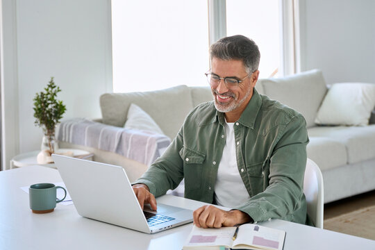 Smiling happy older mature middle aged professional man wearing eyeglasses looking at computer sitting at living room table, using laptop hybrid working, elearning, browsing online at casual home.