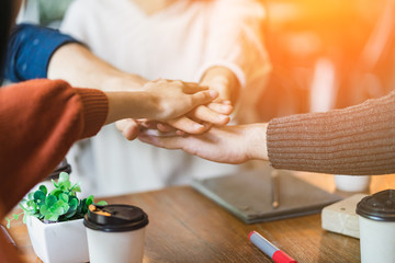 group of multi nation friends enjoy conversation with fun and happiness meeting business casual ideas concept with cafe restaurant background