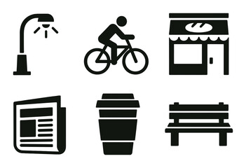 Silhouette city life icon set. featuring streetlight, cyclist, shop, newspaper, coffee cup, bench symbols.