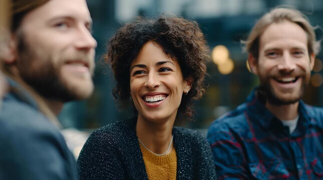 Smiling friends outdoor conversation diverse group candid portrait of woman and man, casual urban vibe with joyful laughter, relaxed daylight coffee