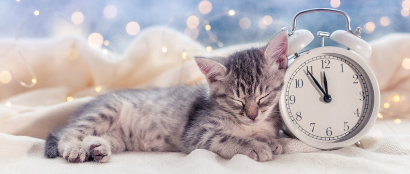Adorable tabby kitten cat sits on a knitted blanket. 2022. Christmas and Happy New Year domestic animal.