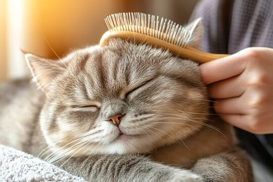 Gentle grooming session A tabby cat patiently receives a brushing from its loving owner indoors soft