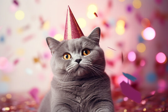 smiling cat with a party hat celebrating at festival event, party time, Portrait, new year eve, funny times,  illustration digital generative ai design art style