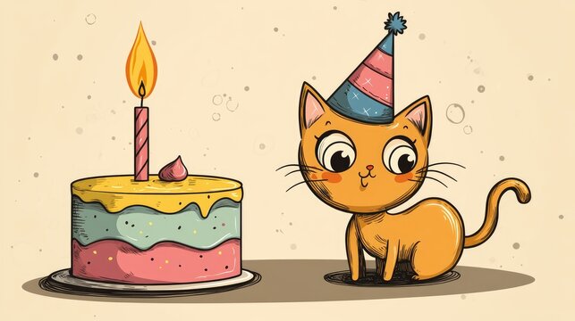 Cute cat wearing colorful party hat sitting beside layered birthday cake with lit candle, ideal for festive greeting cards and invitation designs, celebration-themed keywords