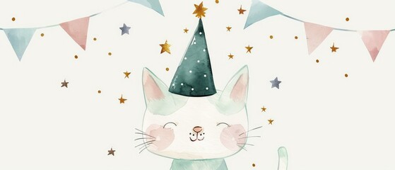 Cute watercolor illustration of a cat wearing a party hat. Perfect for children's birthday cards, invitations, and party decorations.