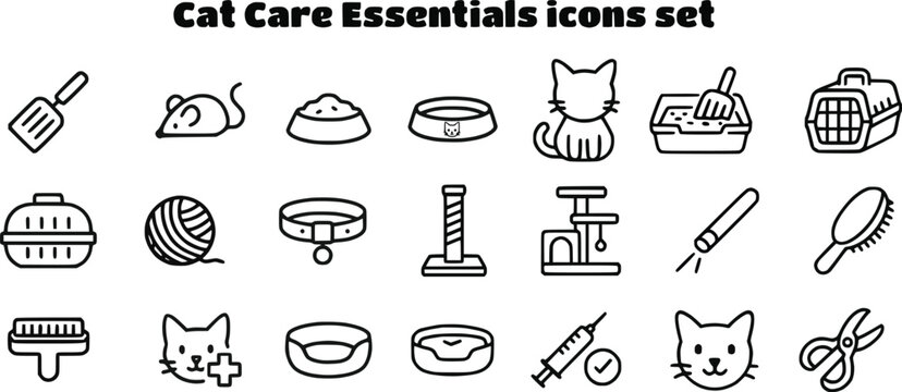 Set of  cat care essentials icons set including litter scoop, toy mouse, food bowl, collar, sitting cat, litter box, carrier, yarn ball, scratching post, grooming brush, medical kit, syringe