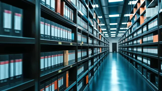 A bright and detailed shot of archive folders with alphabetical tabs, standing in precise rows on sleek black shelves, symbolizing efficient data cataloging.