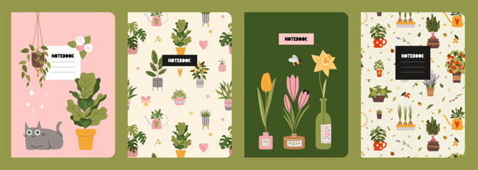 Trendy covers set on a plants theme, cartoon style vector illustration. Cool design with floral seamless patterns and cute cozy home objects. For notebooks, planners, brochures, books and catalogs