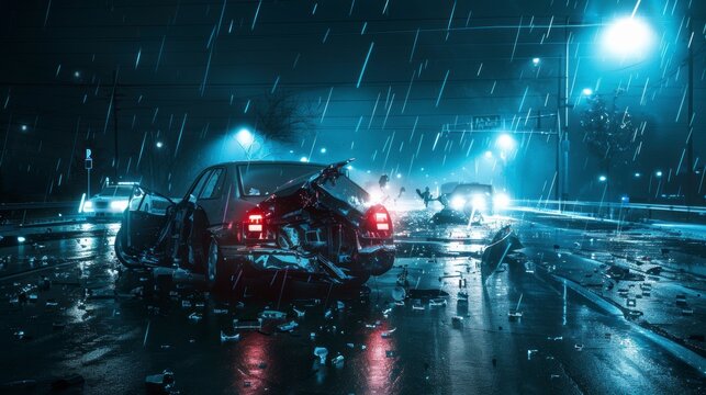 view of a catastrophic car accident on a dark road at night, with flashing lights and wrecked vehicles