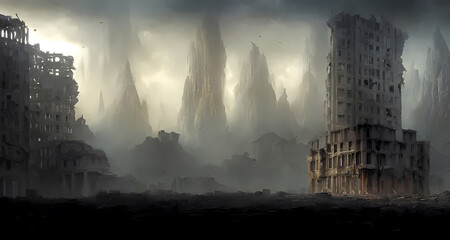 Ruined City. Remains Unusable. Apocalypse Natural Or War. Sad Landscape Of Destruction. Movie Concept Digital Painting
