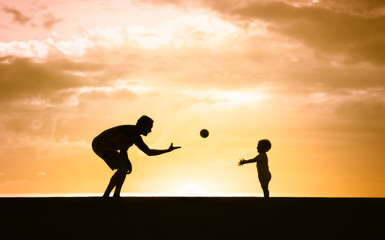 Handsome dad with his little cute sun are playing baseball on green grassy lawn