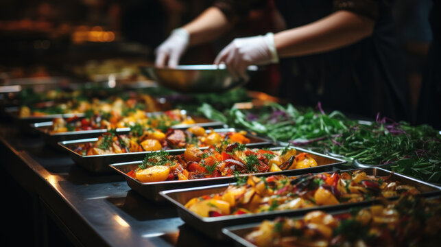 Grilled meat and vegetables, Food on a buffet table at the hotel, Group of people on catering buffet food indoor in restaurant with grilled meat Buffet service