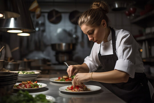 A young female chef garnishes a dish in a restaurant kitchen. AI generated.