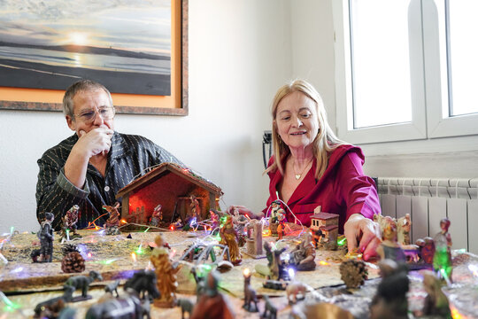 Proud student holding a Christmas Nativity drawing in a classroom. A young boy shows his religious art project at school. Childhood creativity and Christian education concept