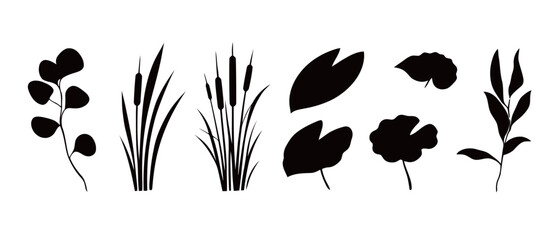 A creative set of minimalist black silhouettes of various plants, including reeds, cattails, and lily pads, perfect for a variety of botanical illustrations and logos.