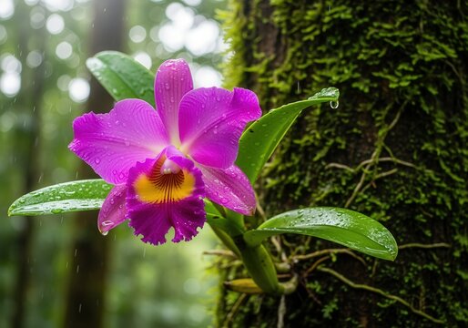 Vibrant purple cattleya orchid with raindrops in lush Brazilian forest setting