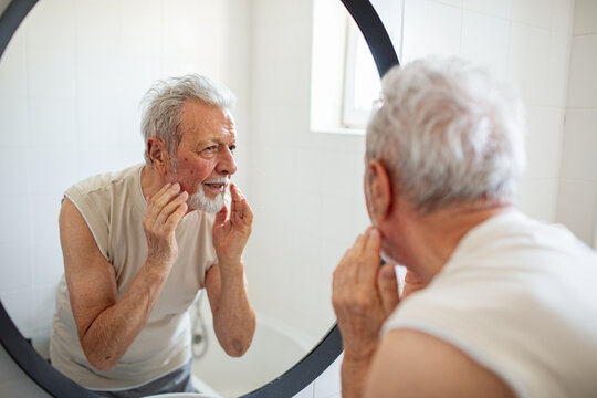 Man touching his short beard. Isolated on gray background. Men's issues. Face closeup. Front view.