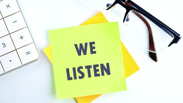 Animation, the appearance of a conceptual expression, the words WE LISTEN on a sticker on a white background