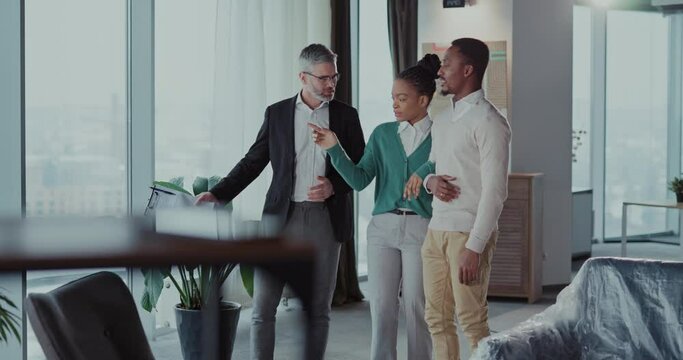African american couple visiting new home talking to rela estate agent adult communicating about moivng in showing modern apartment.