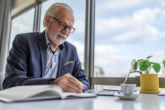 Mature businessman or entrepreneur working on laptop computer and taking notes and writing. Handsome senior business leader working in a modern corporate office next to large window