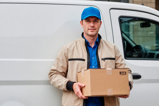 Portrait of Caucasian young adult man standing in front of delivery van holding cardboard box, wearing cap and jacket, looking directly at camera with neutral expression