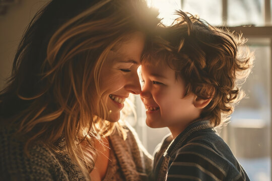 Affectionate moment between smiling caucasian mother and son at home, showcasing a warm, loving family dynamic