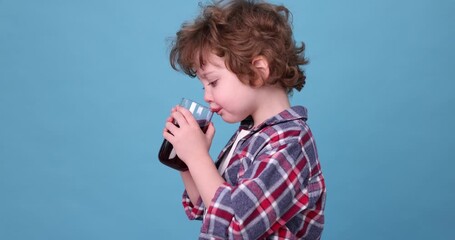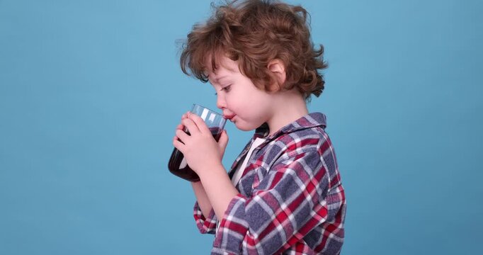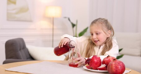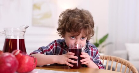 Little boy drinking fresh pomegranate juice at table indoors. Space for text