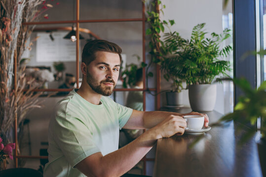 Side view young confident caucasian man 20s in mint casual t-shirt drink tea hold cup of coffee indoors cafe with houseplants look camera Urban leisure lifestyle catering establishment lunch concept.